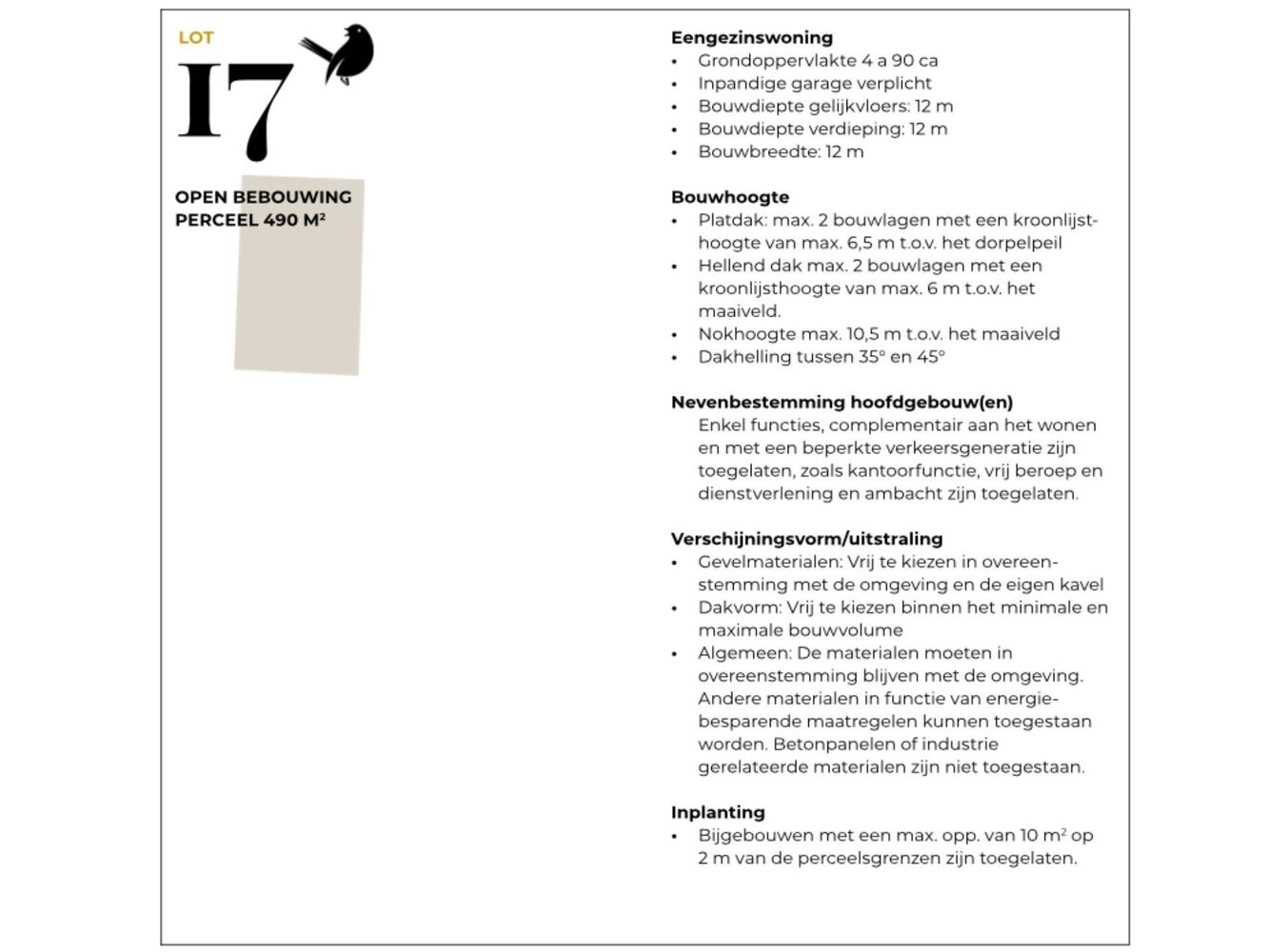 hellend dak met een harmonieuze dakhelling tussen 35° en 45°. De architectuur en materialen zijn vrij te bepalen binnen het karakter van de buurt, met ruimte voor energiezuinige oplossingen en eigentijdse vormgeving.