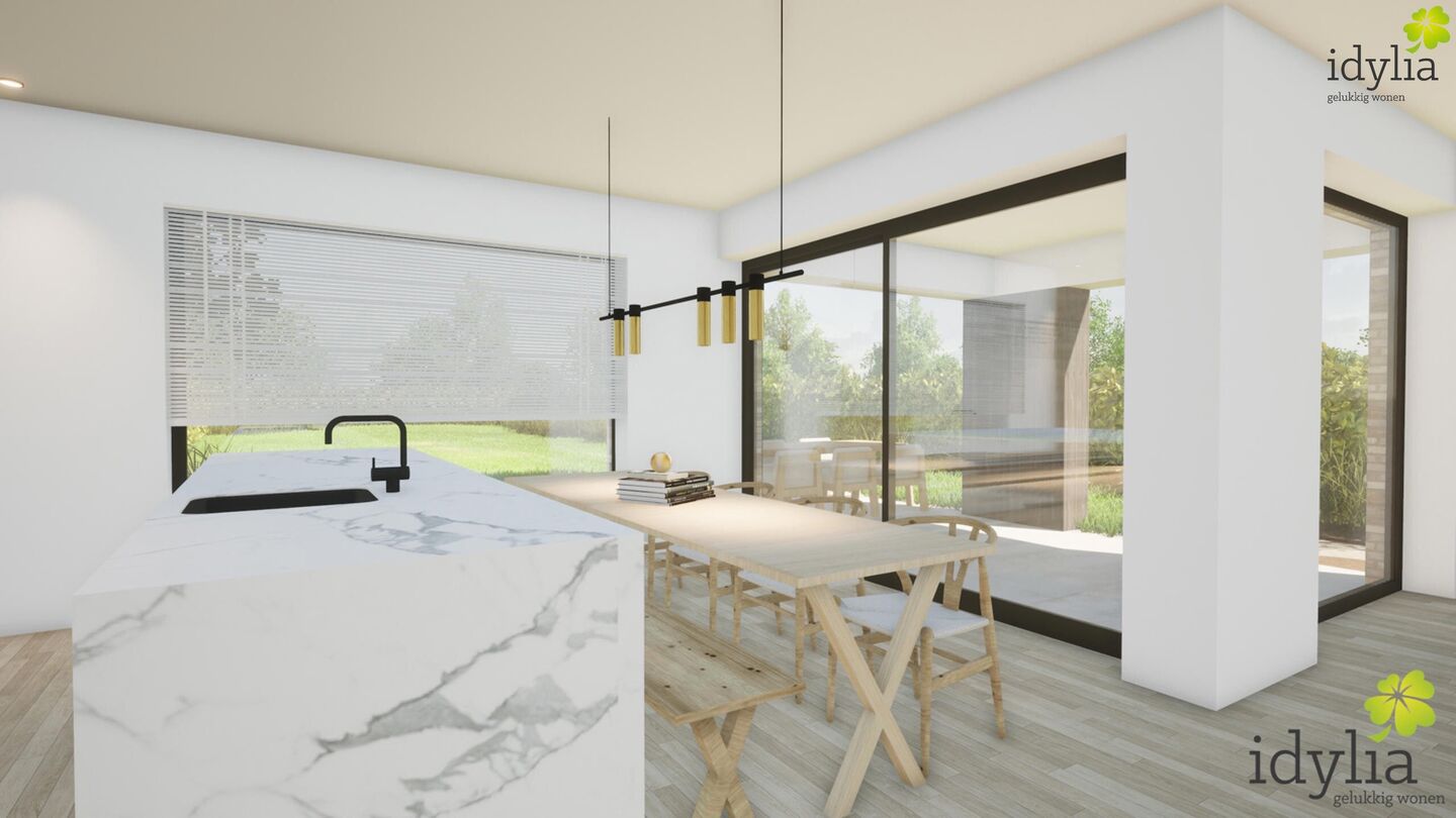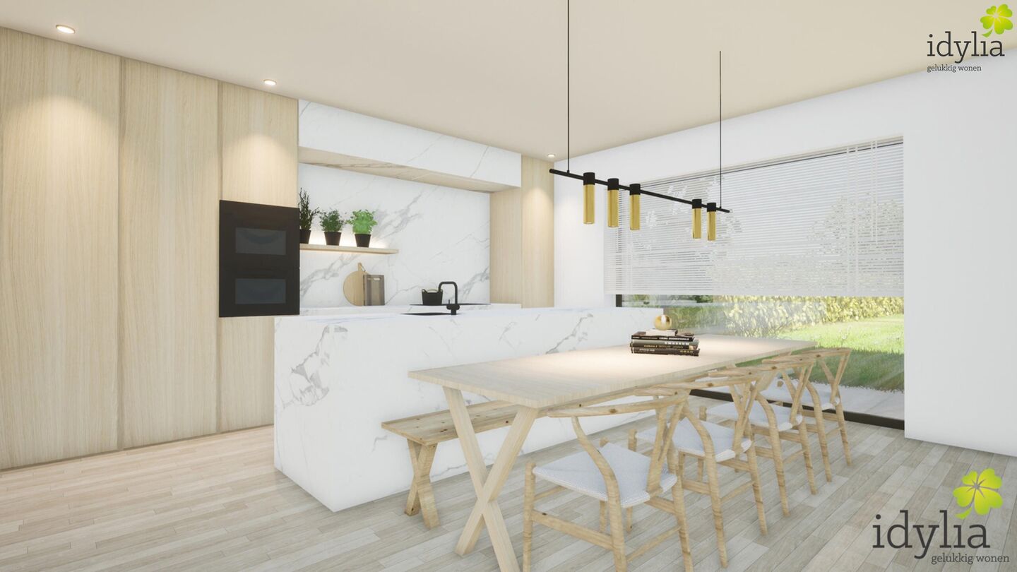 5a 37ca wordt een prachtige BEN-woning gerealiseerd die inspeelt op alle noden van een toekomstgericht gezin. Het open woongedeelte met grote raampartijen voor- en achteraan zorgt voor maximale lichtinval en een warme, uitnodigende sfeer. Hier vloeien koken, eten en leven harmonieus in elkaar over.